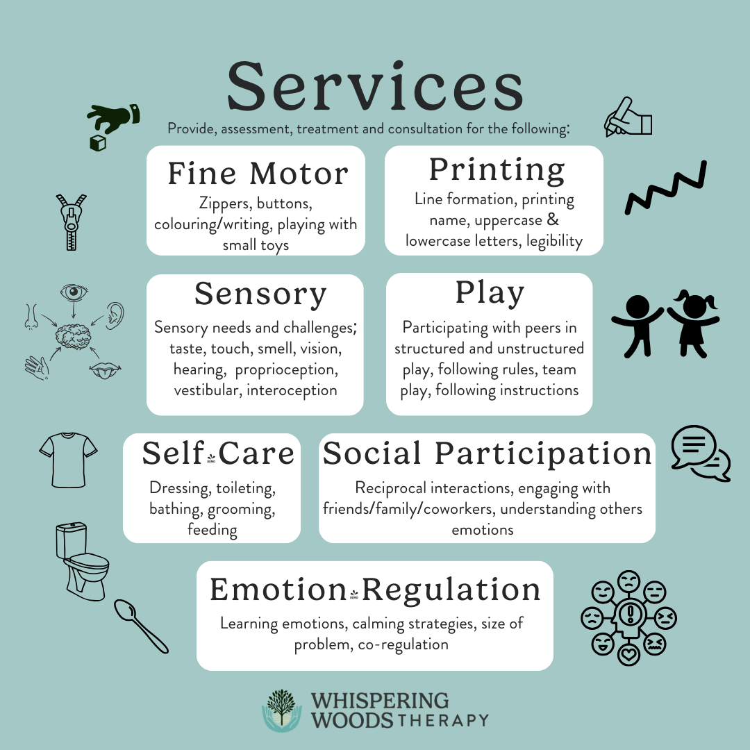We offer a wide range of services to all ages (children, youth and adults). Due to the wide breadth of skills occupational therapists have, we can support in all areas of your life. Sometimes that is too general of a response so the pictures to the side outline what we can offer.